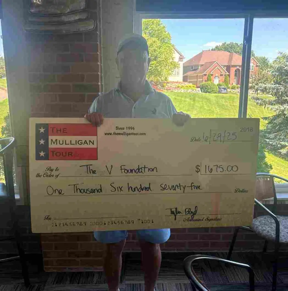 Sponsor Chuck Withey accepts big donation check in memory of Christopher Cooley.