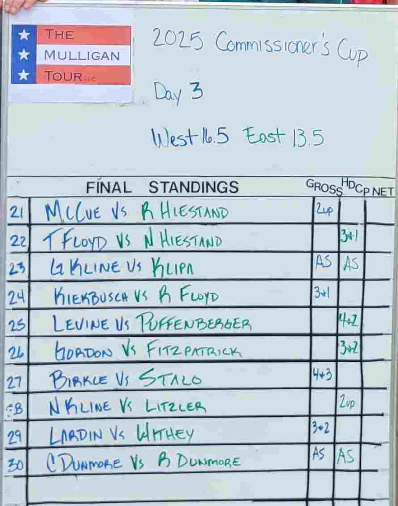 In the closest match since 2020, Team West retained the Commissioner’s Cup by a 16.5 to 13.5 score.  Every member of both teams scored a point. Eric Birkle, Brian Lardin and Eric Kiekbusch led Team West with 4-1-0 records. Team East was led by Jeff Klipa, Helen Puffenberger and Nancy Hiestand at 2-2-1.  12 of 30 matches made it to the 18th hole. Many matches saw a team or player get up early and hold on throughout. A few exceptions were: Chuck Withey and Chris Stalo flipped their day 1 Alternate Shot match by winning the 17th and 18th holes. Puffenberger and Nancy Hiestand came back in day 2 Best Ball to even the match on 16 and push the last two holes for a split point. Birkle and Chris Dunmore got up 3 different times on Withey – Stalo in their day 2 Best Ball only to fall back and need a 18th hole par to take the match. In a marque match of the final day, Greg Kline made a furious late comeback from 3 down to halve his match with Jeff Klipa and get the Cup clinching point. And in the final match of the event, the crowd got all they wanted as Rich Dunmore won the 18th hole to catch brother Chris and split the match. We’re left wondering still who Mama Dunmore’s favorite is.